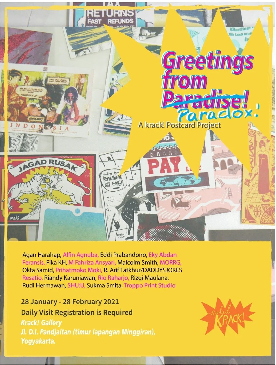 Featuring: Agan Harahap, Alfin Agnuba, Eddi Prabandono, Eky Abdan Ferancis, Fika KH, M Fahriza Ansyari, Malcolm Smith, MORRG, Okta Samid, Prihatmoko Moki, R.Arif Fatkhur / DADDY’SJOKES, Resatio, Riandy Kurniawan, Rjo Raharjo, Rizqi Maulana, Rudi Hermawan, SHU-U, Sukma Smita, Troppo Print Studio